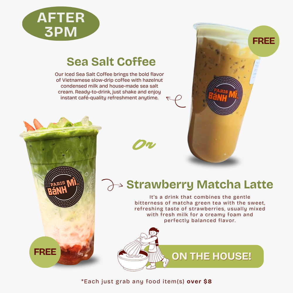 Sea Salt Coffee or Strawberry Matcha Latte — on the house!